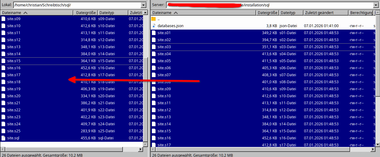 Im Rahmen der Akeeba Rücksicherung unterbricht man im Moment der obigen Fehlermeldung den Import und kopiert sich via FTP oder SFTP die Daten aus dem Ordner installation/sql auf die lokale Festplatte.