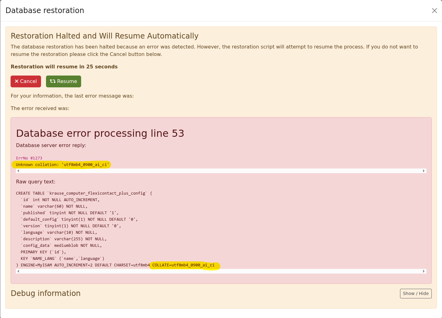 Eigentlich verfügt Akeeba über einen Mechanismus, die Version der Datenbank abzufragen und bei Inkompatibilität die Collation passend zu ersetzen. Das funktioniert jedoch offensichtlich nicht so, wie es von den Entwicklern vorgesehen ist.